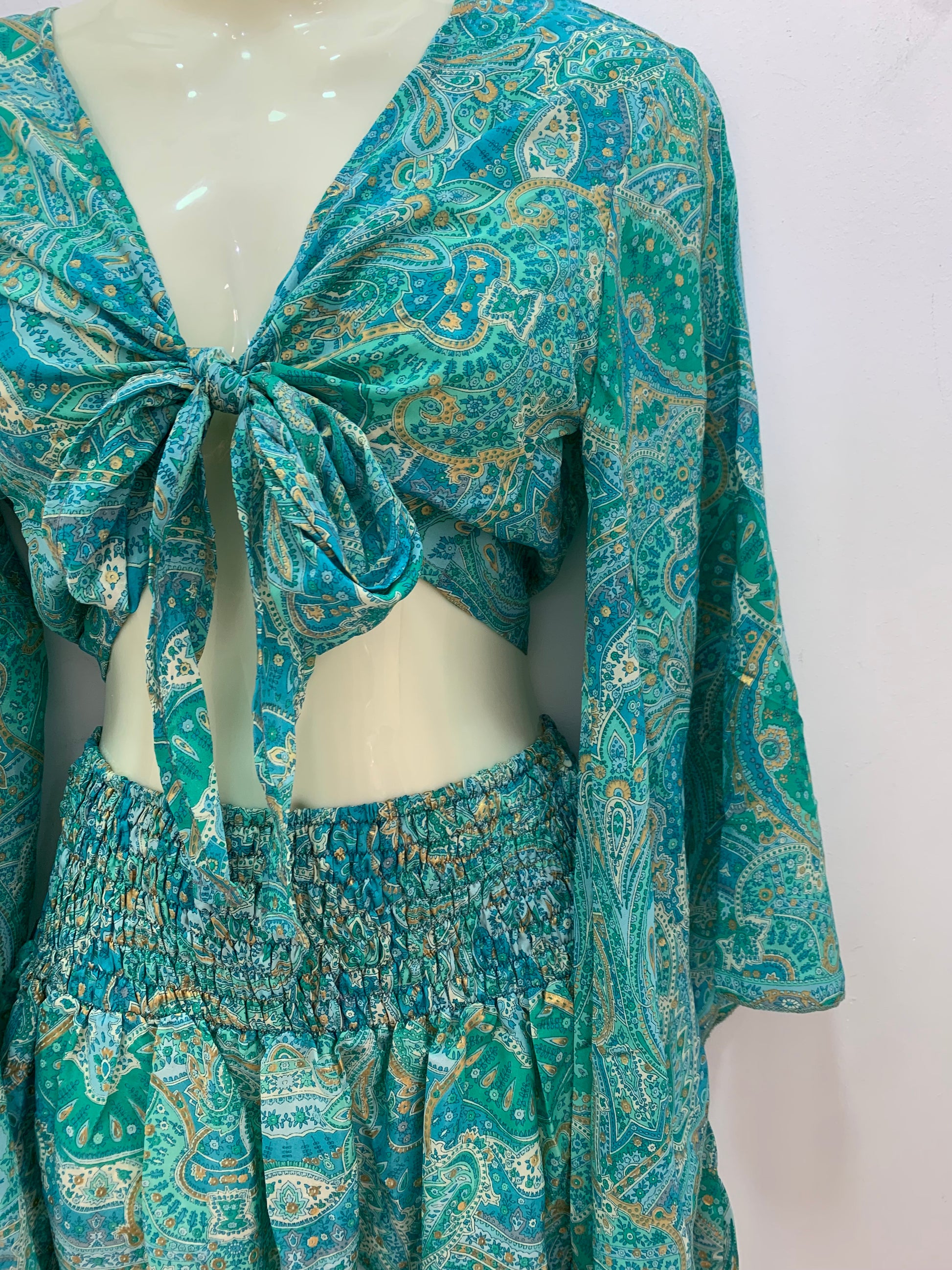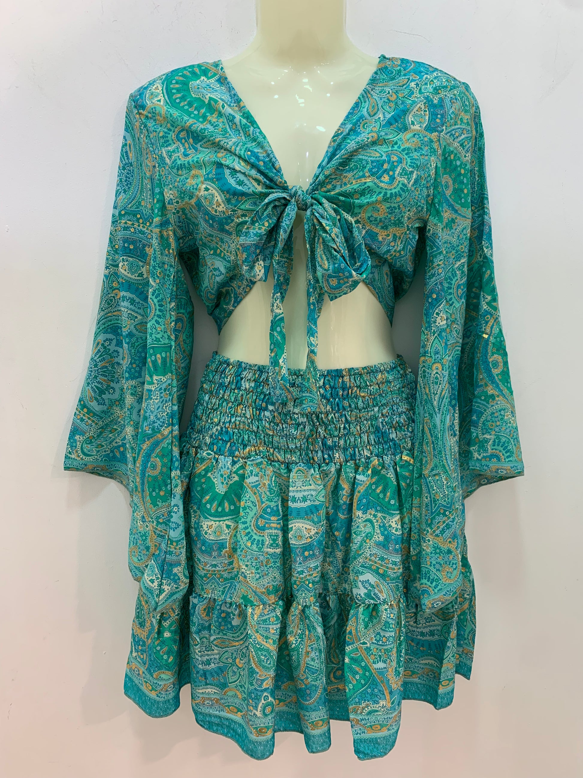 Conjunto corto: top atado manga larga y falda con cintura elástica.