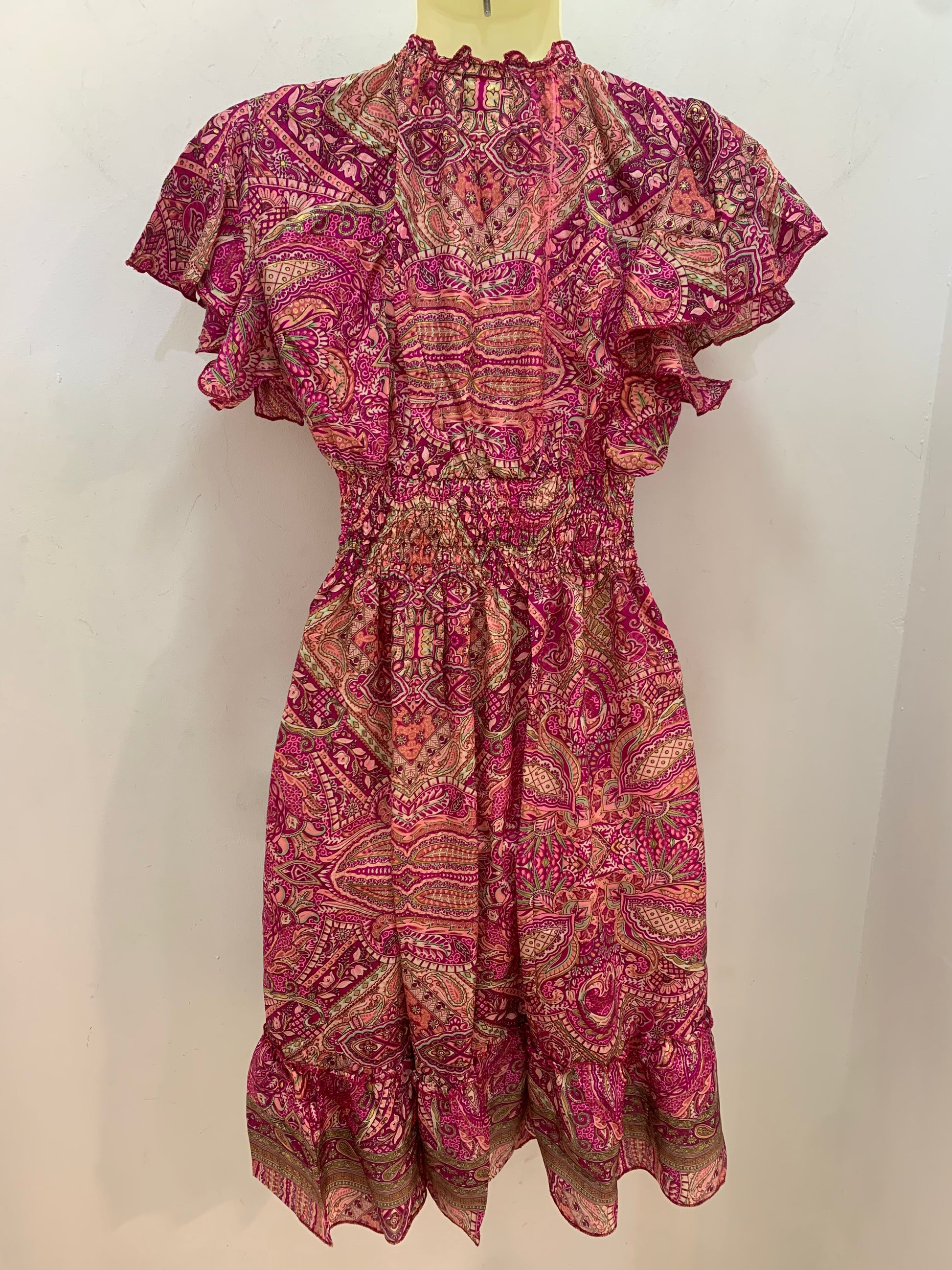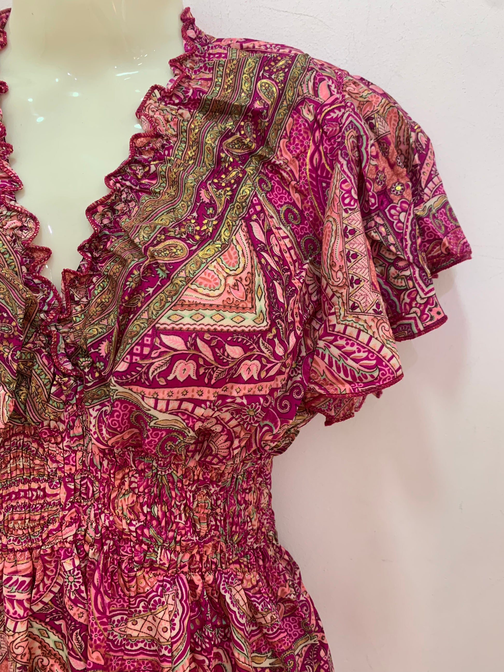 Vestido corto con manga corta y elásticos en escote y cintura.