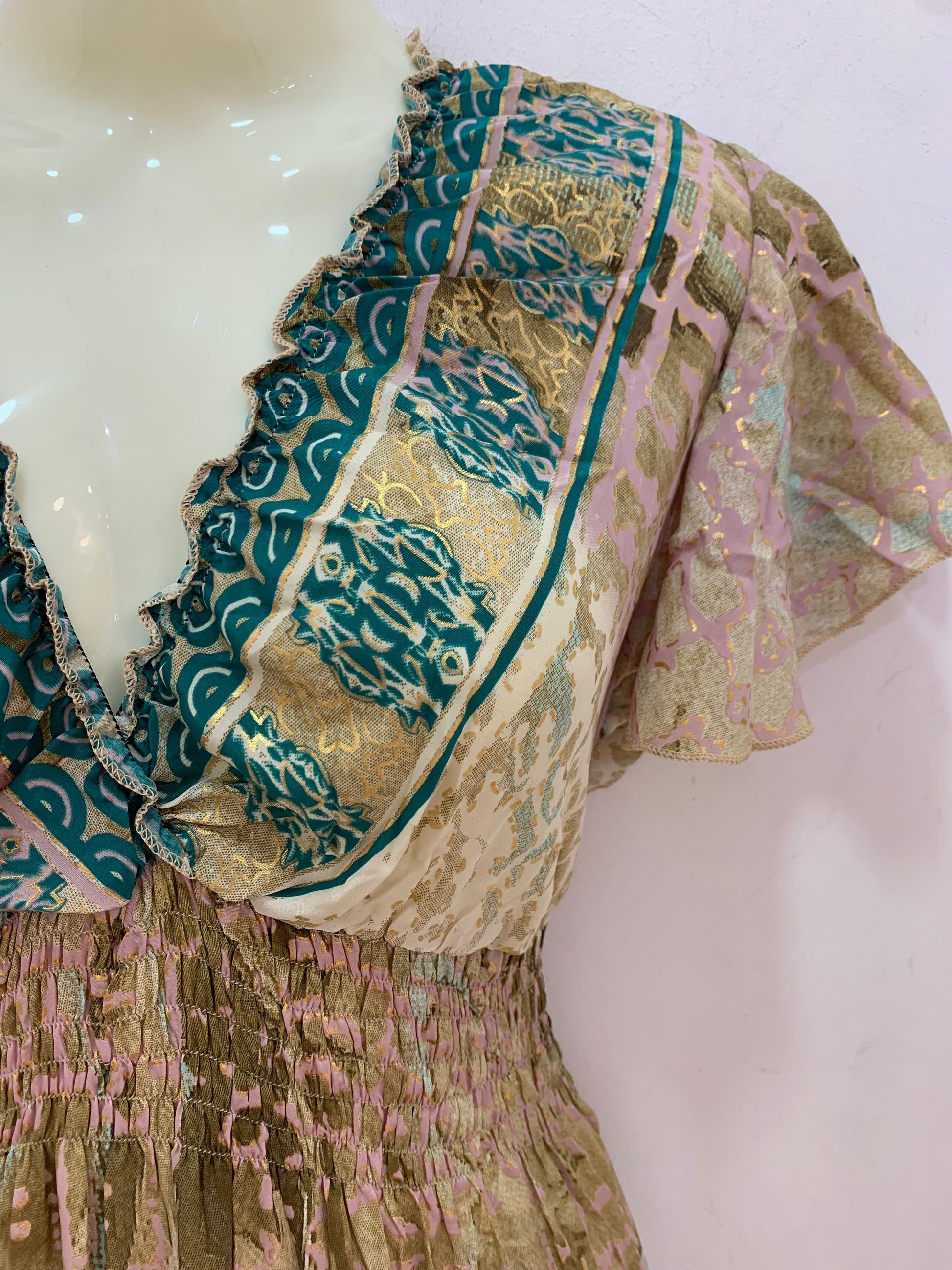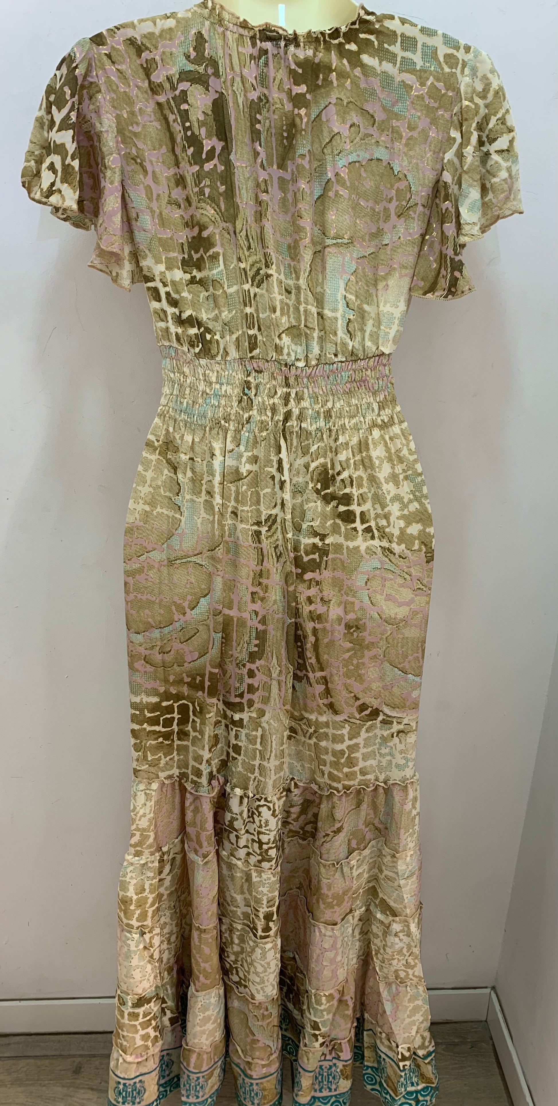 Vestido largo con manga corta y el elástico en cintura y escote.
