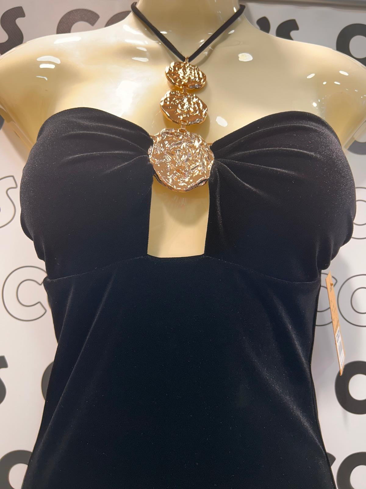 Vestido Largo de terciopelo . Palabra de honor atado al cuello y detalle en dorado con abertura en un lateral hasta la rodilla.
